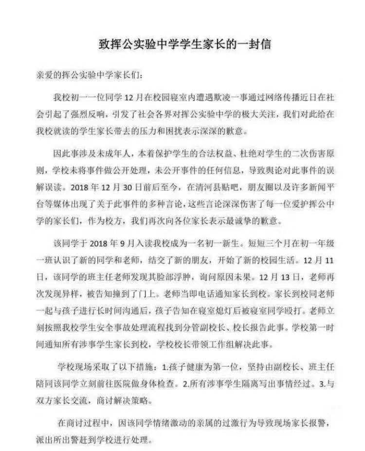 挥公中学就欺凌事件发公开信称校园暴力是社会问题