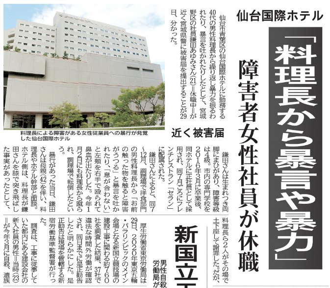 仙台国際ホテルで障がい者女性社員に中川浩司料理長が暴言や暴力のパワハラ発覚